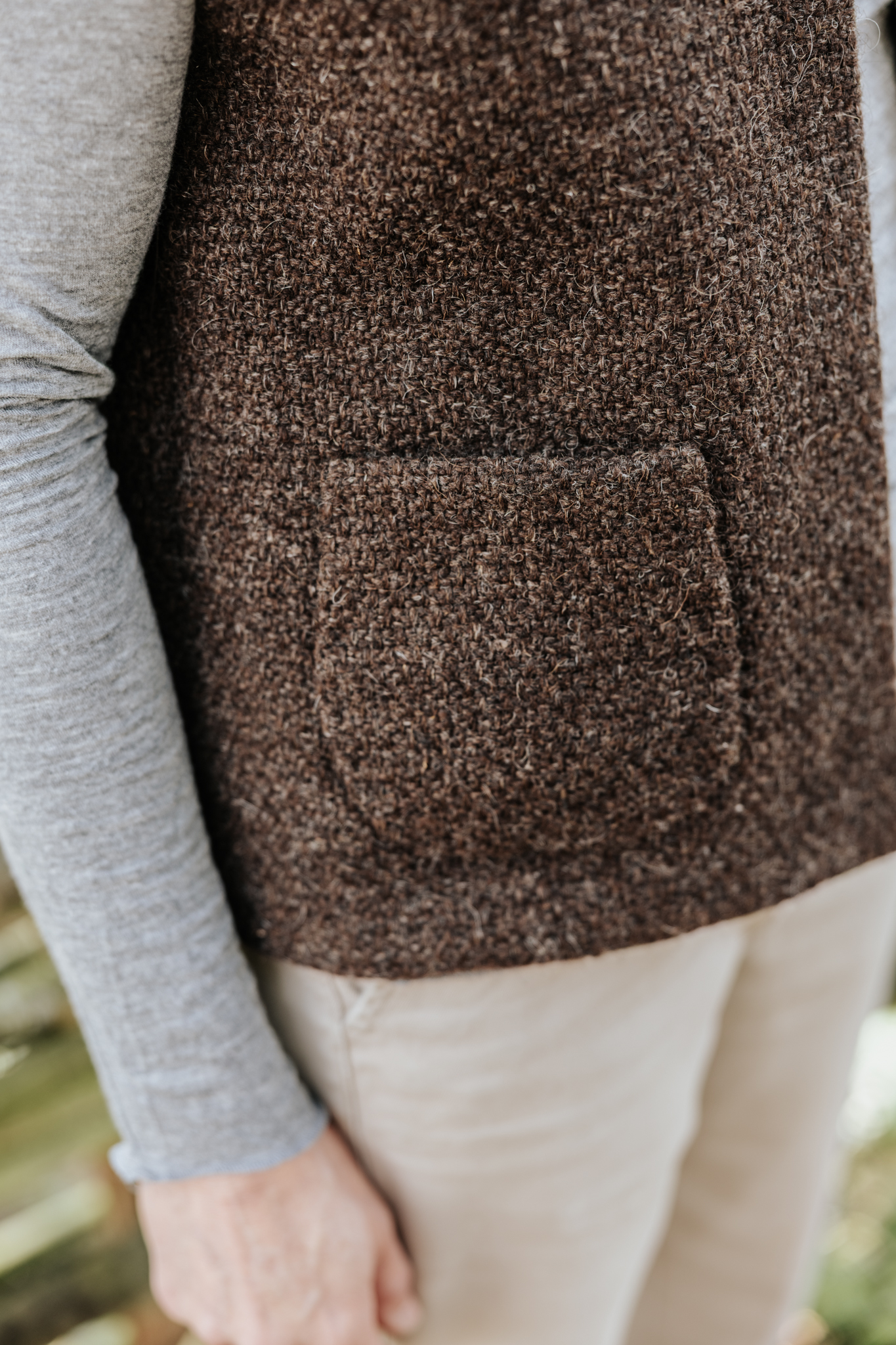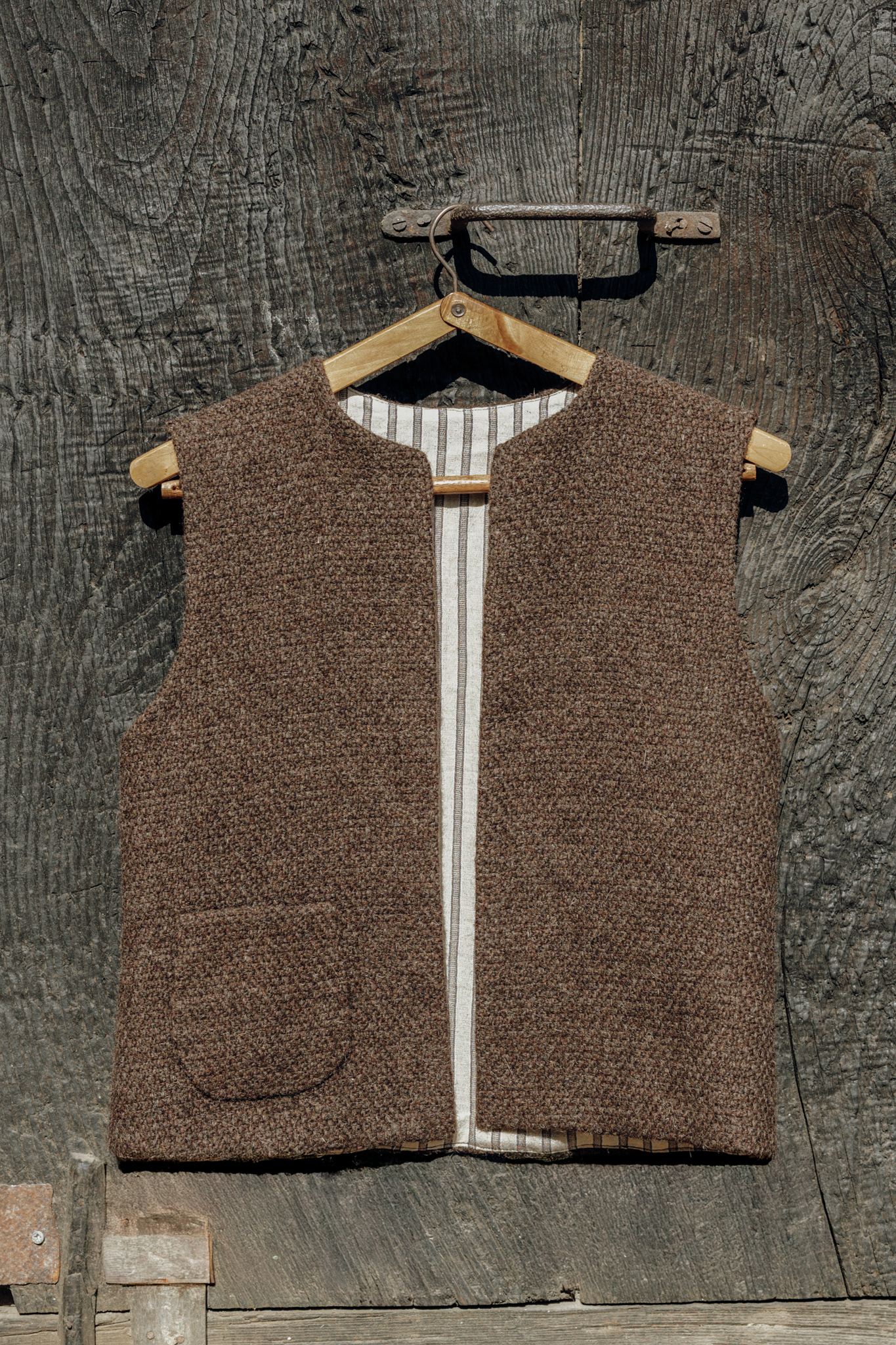 Un chaleco tejido en telar con lana negra de oveja xalda, sin tintes, del color natural del animal y del territorio.